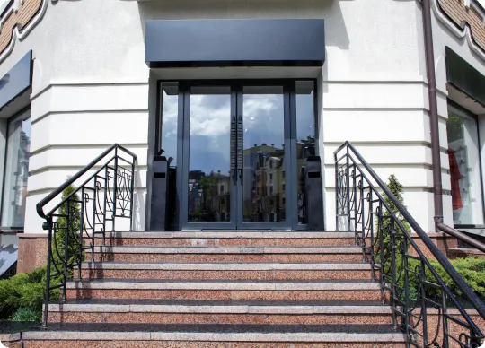 К первой относятся банки, супермаркеты, развлекательные и бизнес- центры. Вход в такие здания должен быть удобным, безопасным, выдерживать повышенные нагрузки и обладать высокой пропускной способностью.