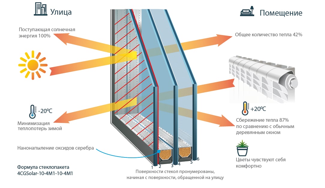 При установке сторона с напылением располагается в первом ряду от комнаты покрытием внутрь. При покупке пакета с дистанционной алюминиевой рамкой лучше выбрать двухкамерную модель, такую как двухстворчатые окна. Это позволит избежать образования конденсата и наледи.